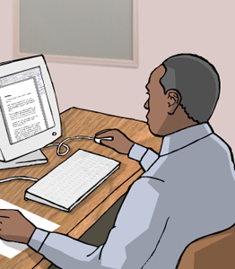 While his two colleagues are working on their assignments, Dr. Carama drafts an announcement for the meeting.